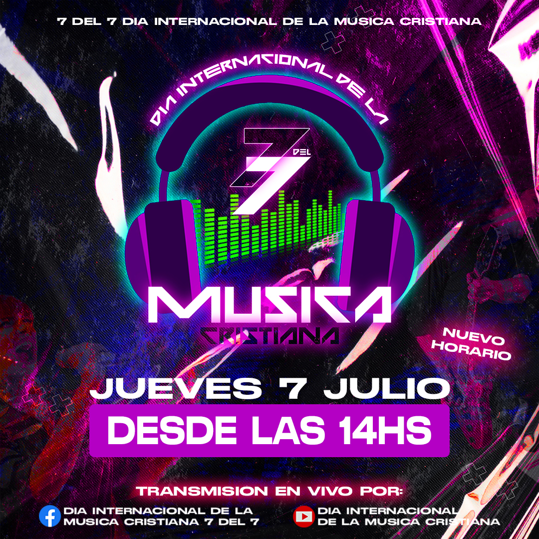 Este 7 de Julio del 2022 desde las 14 Hora Argentina se trasmitirá el 7 Del 7 Dia Internacional de la Música Cristiana Online edición 2022 desde el canal de YouTube oficial del 7 Del 7 https://www.youtube.com/c/DIAINTERNACIONALMUSICACRISTIANA allí mas de 70 participantes de mas de 13 paises de todas partes del mundo estarán participando de la nueva edición del Dia Internacional de la Música Cristiana online.